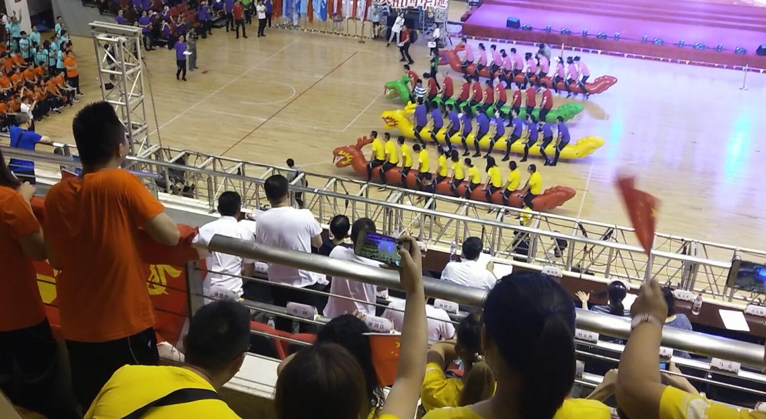 本次歌运会将演唱红歌和趣味运动会相结合,是武汉建设监理与咨询行业协会对大型活动内容和形式的又一次创新。活动现场,来自100余家会员单位的运动员、歌唱演员和观众被有序分成八个自治组方阵,分别着赤、橙、黄、绿、青、蓝、紫、玫红八种颜色运动服,整齐落座在指定区域。在主舞台两侧,来自各参赛会员单位的各式司旗有序摆放,把会场装点得格外欢腾喜庆。