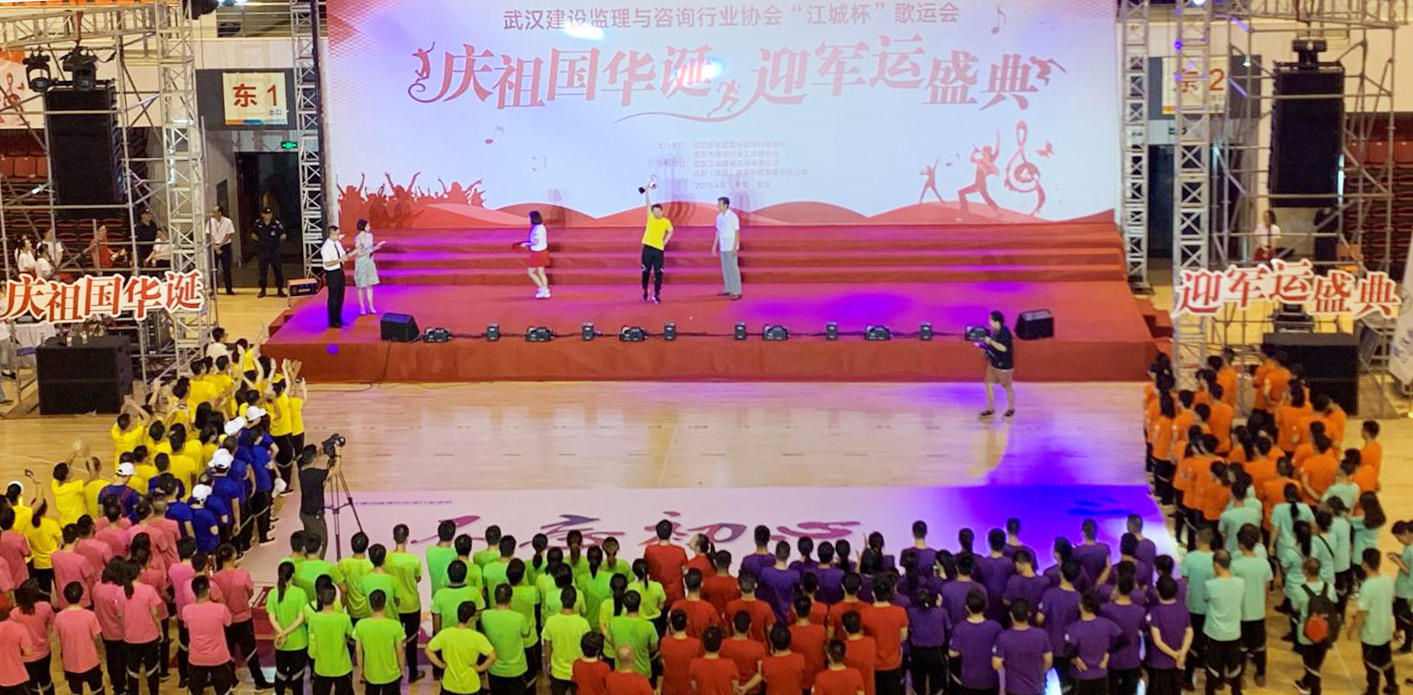 “庆祖国华诞,迎军运盛典”!为庆祝新中国成立70周年,喜迎第七届世运会在武汉召开,9月8日,由武汉建设监理与咨询行业协会与武汉市建筑行业工会联合会联合主办的“江城杯”歌运会在武钢体育中心盛大开幕。来自武汉建设监理与咨询行业一百余家会员单位的1500余名运动员、歌唱演员及观战席代表在这里共同见证了一场精彩纷呈的演出。中国建设监理协会、湖北省住房和城乡建设厅、武汉市总工会、武汉市民政局、武汉市城乡建设局等单位领导到场观赛。